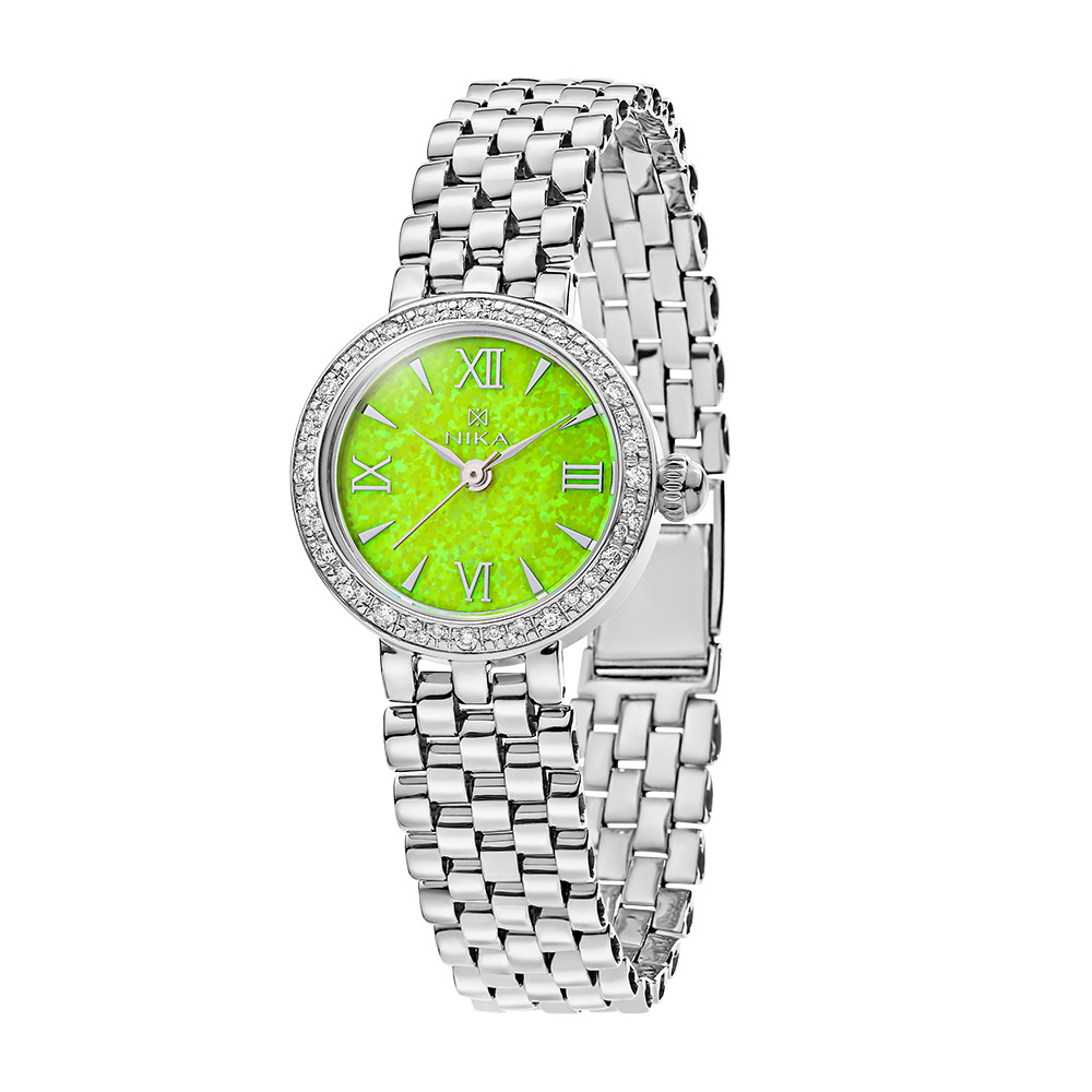 Серебряные часы с бриллиантами и потрясающим опаловым циферблатом редкой неоновой расцветки. Завораживающий 3D-эффект глубины и внутреннего сияния! Часы ANGELIKA демонстрируют нам, что в природе каждый камень наделен неповторимым очарованием – также как и женщина, для которой предназначены эти великолепные часы.