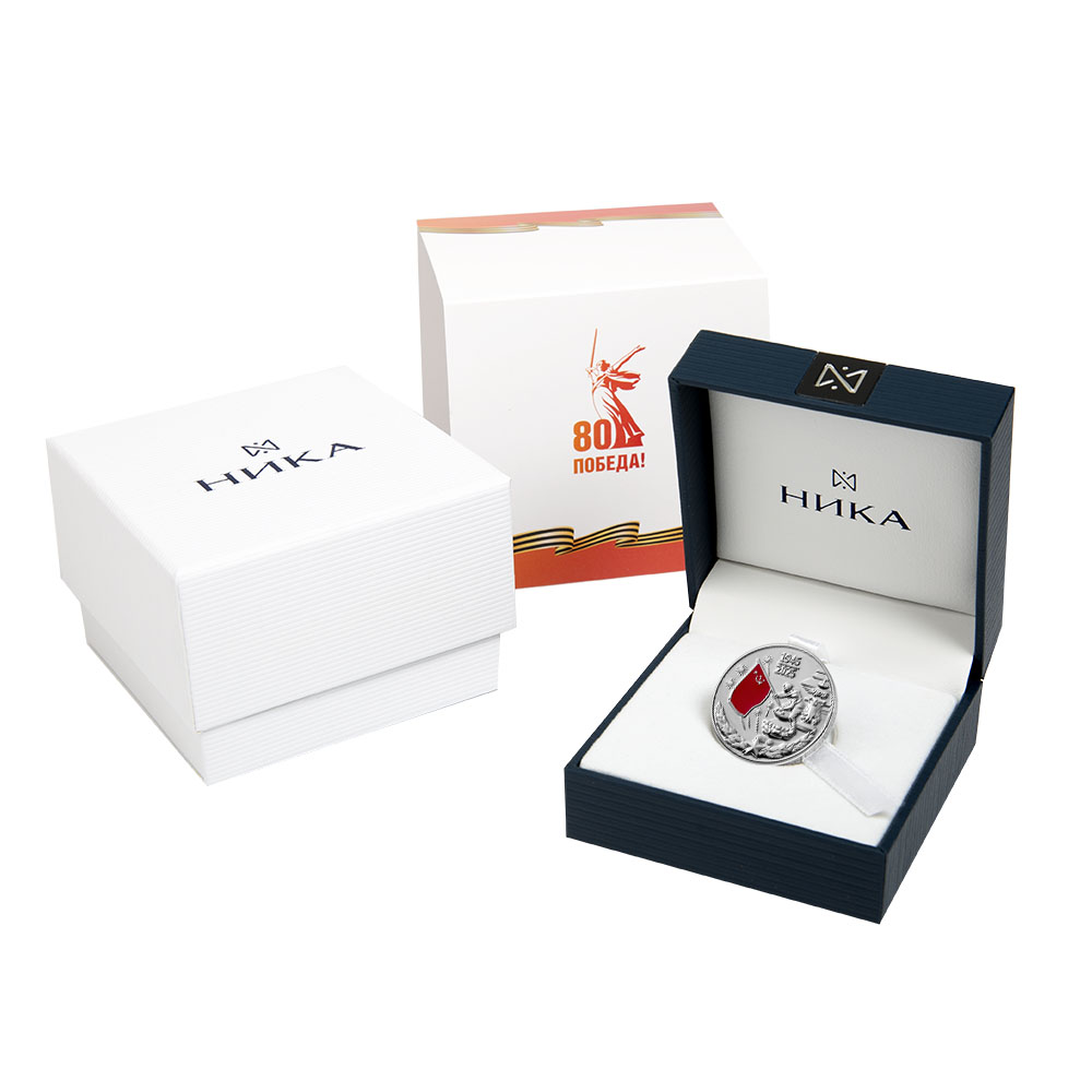 Монета из серебра 999° пробы с изображением символа Победы и Знамени Победы над рейхстагом. Красная эмаль и даты 1945–2025 подчеркивают историческую ценность.