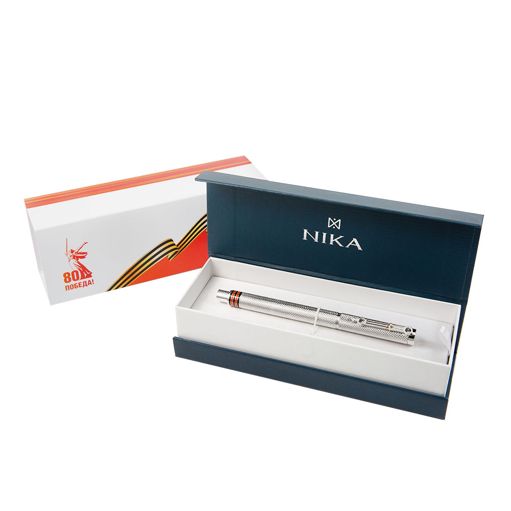 Ручка вдохновлена архитектурой Московского Кремля и символизирует связь времён. Клип стилизован под стрелку часов на Спасской башне и украшен звездой из золота 585° с бриллиантом. Кольцо ручки декорировано эмалью в цвете Георгиевской ленты, а на торце выгравирована надпись «80 лет». Это ювелирное изделие сочетает роскошь, историческую символику и удобство в использовании.