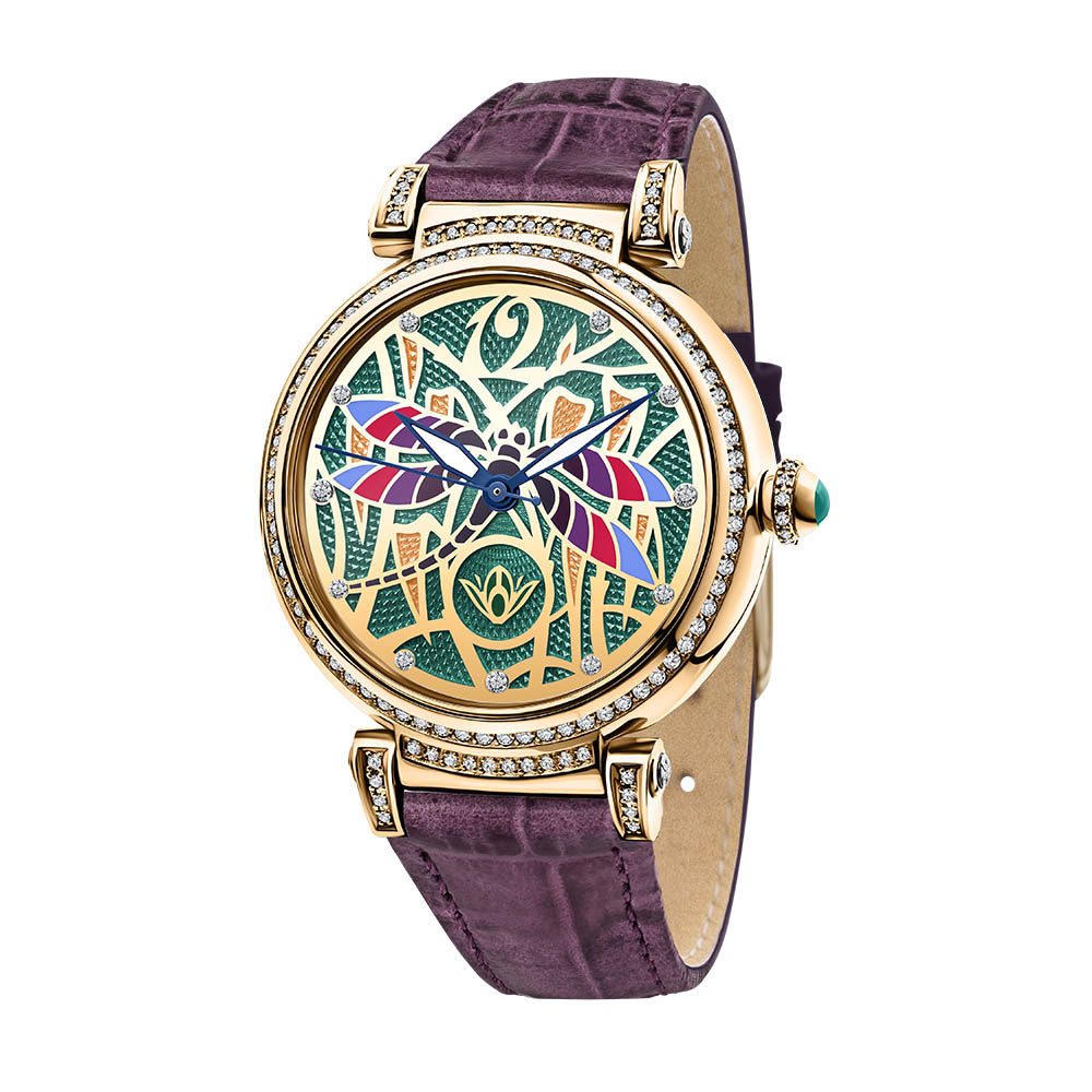В женских часах Loribelle стрекоза с разноцветными крыльями беззаботно порхает над водной гладью, бриллиантовыми каплями росы и фирменным логотипом в виде распускающихся лавровых листьев. Гильошированный циферблат с художественной композицией из серебра с золочением создан вручную в технике «перегородчатая эмаль» – это одна из самых сложных техник в часовом мире. На крышку часов вручную нанесена художественная гравировка в виде лаврового венка, символизирующего победу. В винтах написано название бренда. Корпус, переводная головка и пряжка сделаны из золота, декорированы бриллиантами и немецкой эмалью. Декоративные винты на ушках вручную украшены гравировкой в виде распустившихся цветов. Винты обеспечивают подвижность ушек, тем самым улучшая посадку часов на запястье.