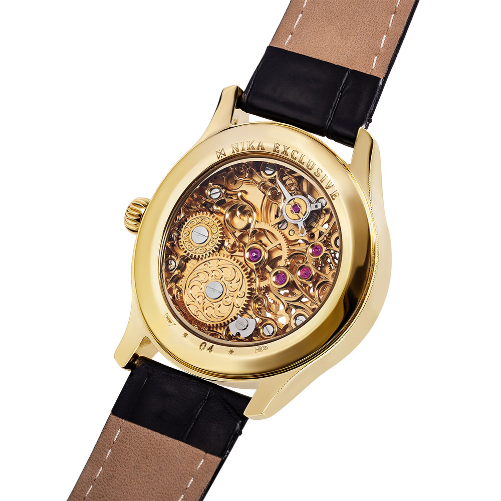 Сердцем часов стал швейцарский механизм, украшенный художественной резьбой и гравировкой. Часовые мастера NIKA вручную превратили каждую деталь в миниатюрное произведение искусства, сохранив при этом безупречную точность хода. Этот удивительный симбиоз функциональности и эстетики делает механизм достойным восхищения.