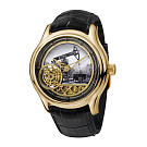 Особое внимание заслуживает черный гильошированный циферблат с сатинированной поверхностью, создающий эффект объемного рисунка. Верхняя часть циферблата открывает вид на резной механизм, демонстрируя филигранную работу мастеров. На отметке "6 часов" отдельно вынесена секундная шкала, которая продолжает раскрывать красоту внутреннего устройства часов. Часовые индексы в виде заостренных лучей добавляют композиции глубины и благородства.