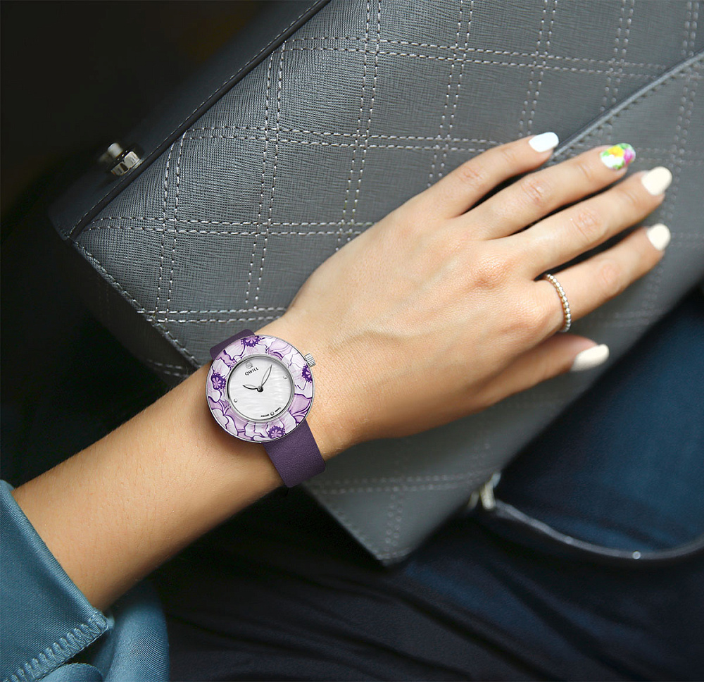 Безель с изысканным цветочным декором из стекла вокруг перламутрового циферблата выполнен в приглушённых оттенках лиловых петуний и идеально подходит для нежного летнего образа.
