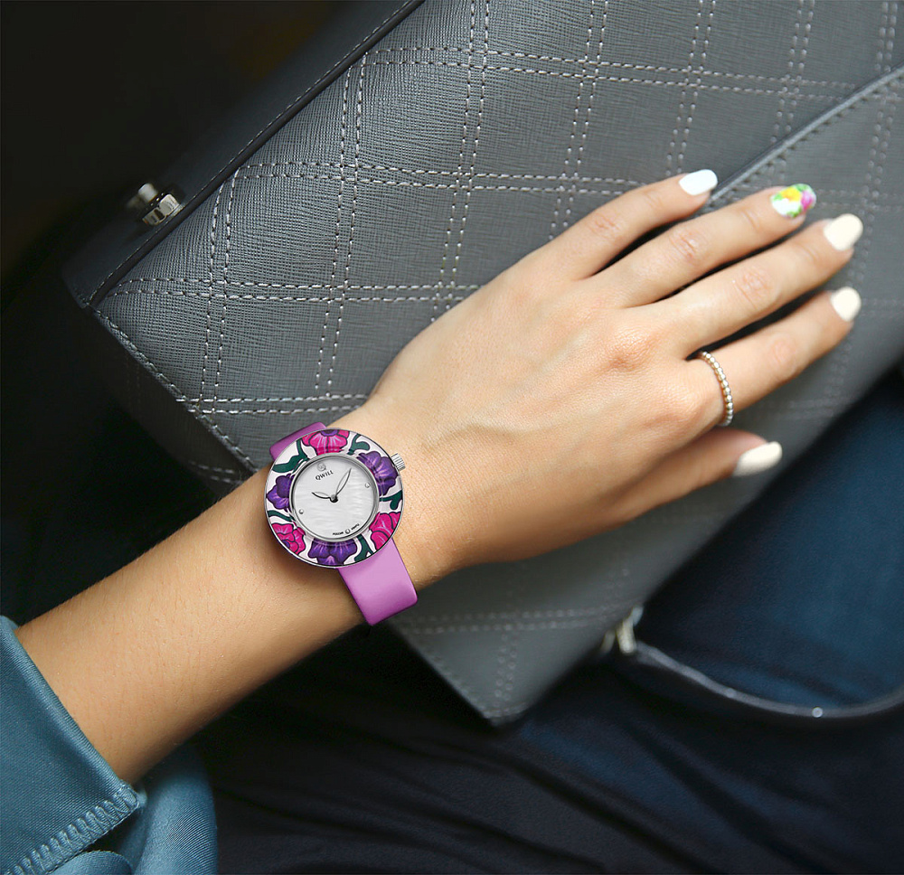 Безель с изысканным цветочным декором из стекла вокруг белого перламутрового циферблата выполнен в оттенках ярко-малиновой и темно-фиолетовой фуксии. Этот яркий оттенок идеально подходит для летнего времени года.