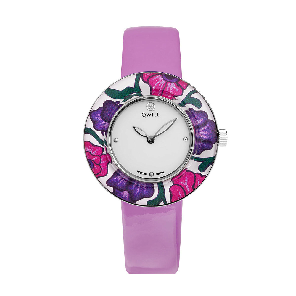 Безель с изысканным цветочным декором из стекла вокруг белого глянцевого циферблата выполнен в оттенках ярко-малиновой и темно-фиолетовой фуксии. Этот яркий оттенок идеально подходит для летнего времени года.