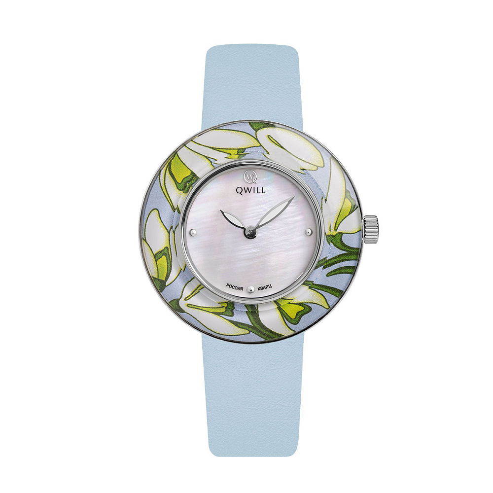 Корпус из серебра 925 пробы с родиевым покрытием сохраняет благородный блеск и защищает от потемнения. Задняя крышка сделана из прочной нержавеющей стали, которая обеспечивает длительный срок службы часов. Безель с изысканным цветочным декором из стекла вокруг перламутрового циферблата выполнен в оттенках свежих ландышей и идеально подходит для летнего времени года.