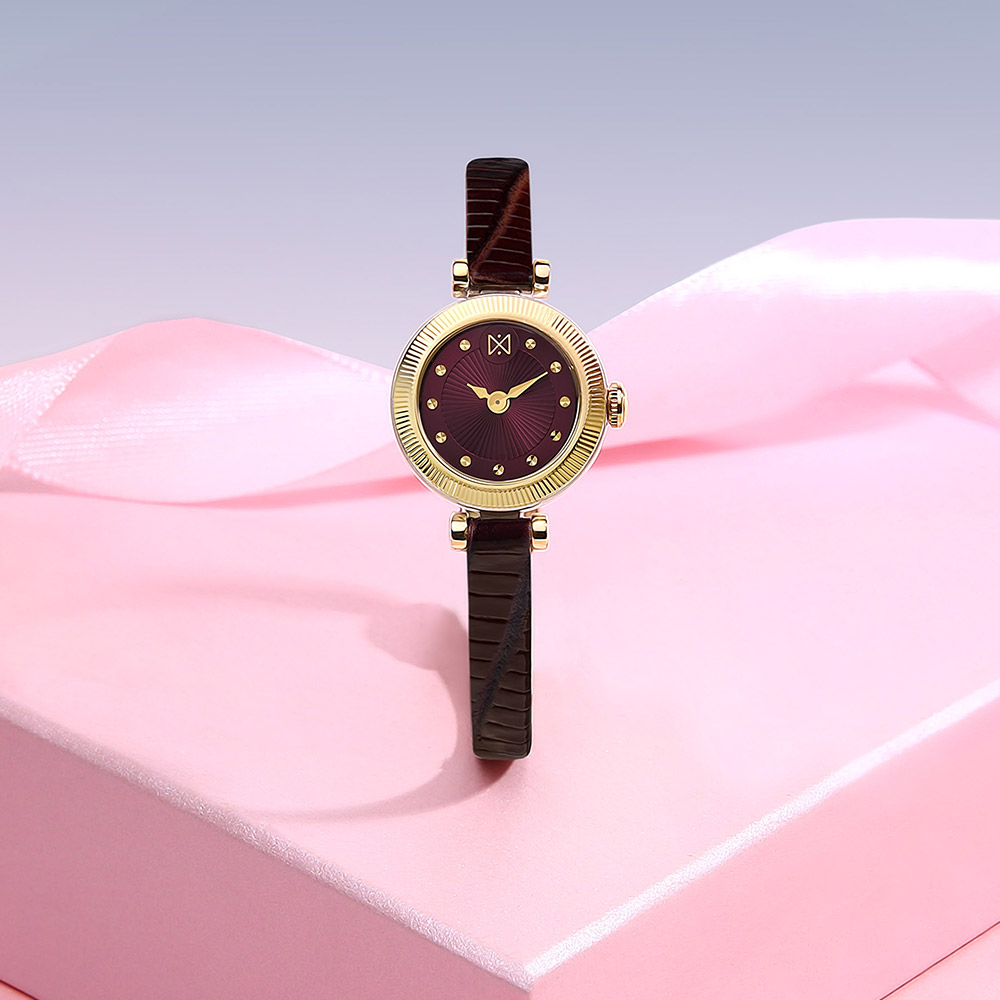 Тонкий ремешок из натуральной кожи гармонично сочетается по цвету с циферблатом