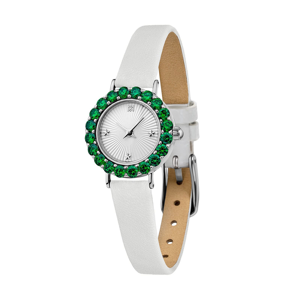 Цветной ремешок сделан из натуральной кожи и прекрасно гармонирует с циферблатом и камнями.