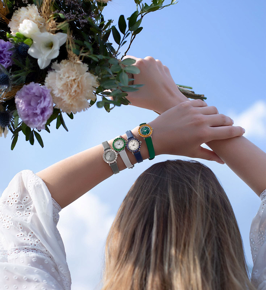 Миниатюрный корпус из серебра 925 пробы украшен цветными фианитами, добавляя яркость и шарм образу. Для создания часов была использована техника ювелирной закрепки, которую используют ювелиры. Циферблат украшен гильоше «солнечные лучи». Вместо часовых меток — аккуратные звезды и фирменный логотип. Аккуратный круглый циферблат выглядит элегантно за запястье.